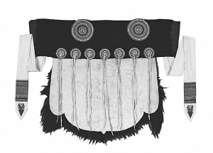 剪裁时,将羊皮修剪成U型,上部横镶一段黑氆氇(毛织品)或黑呢子,内衬天蓝色棉布。其下用七对白色鹿皮条穗缝缀并列的七个小圆形彩线绣花布盘,肩部缝缀两个大圆形彩线绣花布盘。羊皮上端缝钉两条绣花白布长带,带端还绣有花鸟、鱼虫、动物、植物、几何等图案,据说是象征纳西族人民如蜂似蝶地奔忙,以辛勤劳动换取甜蜜生活。