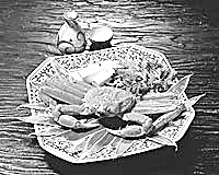 撒嘎当,即螃蟹剁生。以新鲜螃蟹为主要原料,配以糊辣椒粉、姜末、蒜泥、芫荽、南瓜籽、炒米面等佐料调制。加工时,将螃蟹敲死放在火塘中翻烧至熟,去掉硬壳后剁细成泥状,加适量食盐、糊辣椒末、蒜泥、熟南瓜子面、炒米面调拌均匀即成。这道菜味香、辣、鲜,用糯米饭蘸吃,或用萝卜、白菜、水薄荷、野芹菜等蘸吃均可。