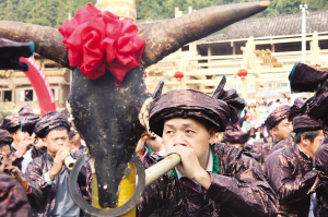 在艺术节上,“二千九”芦笙笛大赛、侗族大歌比赛、侗戏比赛等一系列民族文化活动为重阳节增添了喜庆。据了解,“二千九”泛指在清朝时期按侗款条约制定的2900户人家的所在地,是侗族聚居地。这里以侗族大歌为代表的民族民间文化艺术蜚声海内外。图为当地群众吹奏芦笙笛。