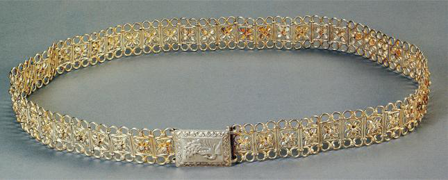 傣族银腰带傣族妇女喜欢带手镯、戒指、耳坠、项链等,这些物饰金质、银质、玉石均可,仿制品也行。女婴生下来几天,就由家长用消过毒的针为娃娃扎耳,为带耳环作准备。对女性而言,银腰带更是不可缺少之物,腰带上饰以孔雀、莲花等各种花型。女人们认为银腰带越宽就越美(图为傣族银腰带,以上图片为中央民族大学博物馆馆藏)。