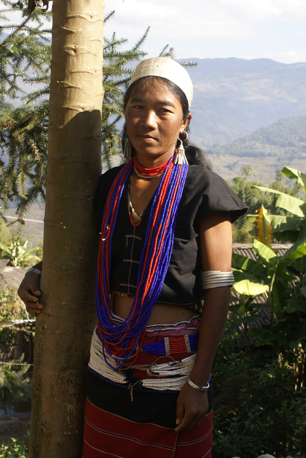 而妇女们的装束特点分明与众不同。最突出的是头戴宽约3公分左右的银箍,留长发;身着靛青色无领大襟右衽及横条花筒裙。腰系红布宽腰带和数十根细藤圈。耳挂垂肩圆形大耳环,颈戴银质大项圈,细项链。上了年纪的人,喜欢戴长约五公分伞状大耳筒,筒顶还刻有各种花纹。有的妇女在耳筒内插上香花香草,有的放上人民币,出门赶集,随用随取,很是便利(上下两图由刘军供图)。