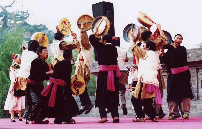 羊皮鼓舞是羌族重要的舞蹈形式。羌族人每遇病、丧之事,都要请巫师跳皮鼓。巫师一般为2人,1人举短戈在前,1人左手持单面鼓,右手持弯把鼓锤敲击,并摇晃鼓内的小铁环哗哗作响,开始在一阵吆喝和鼓声震天的热烈、紧张气氛中边击鼓边跳,走步时脚不停的颤动,带有神秘感。主要步法有:甩鼓步,两脚八字分开,鼓先落在两胯之间,然后向上甩,同时击鼓。两边踮跳步,前脚向前跳,后脚以脚尖点地跟出,左右交换击鼓。还有开胯下蹲跳步、松膝绕步等。也有原地打“旋子”的技巧动作,其动作节奏明快,激烈而敏捷。一般在老年人死后,跳皮鼓要进行3天3夜,死者的亲朋故友都要参加跳皮鼓,人数不限,跟在巫师身后,从右到左,或由左到右地跳动。先成曲线队形,然后成圆圈。跳皮鼓以表演者手中所持羊皮鼓、串铃等为伴奏,鼓点种类繁多,相传过去跳皮鼓的鼓点曾有108种之多。