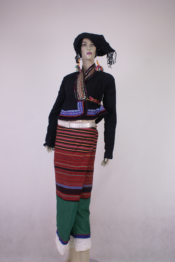 妇女的衣裙与傣族相似,上穿紧身短衣,头顶挽髻,用头巾缠头,喜欢戴大耳环、银手镯等装饰。姑娘爱戴野花或自编的彩花,将双颊染红。一般,女子上着左右两祚斜襟窄袖黑色小褂,小褂为圆领、紧腰、宽摆,短及臀部,在左肋下拴线打结,已婚妇女用黑色布料,未婚姑娘喜浅蓝色或白色。里衫为无袖贴身夹衫,下穿两条筒裙,内裙为白色,外裙有两色,臀部以上为红色横条,腿下为绿色或黑色,用布条或花边镶饰。未婚妇女用黑或蓝布包头;已婚妇女梳发髻,插银簪,顶端镶3颗棱形玻璃珠,下系银链,缠包头。妇女戴银耳环、项圈、手镯等饰品。