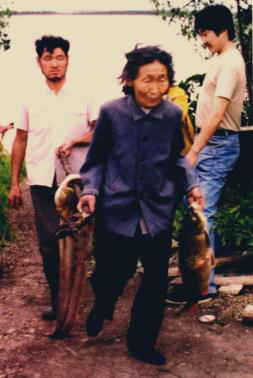 图八 图九 赫哲族妇女用木铡刀熟鱼皮 将熟好的鱼皮连成大片