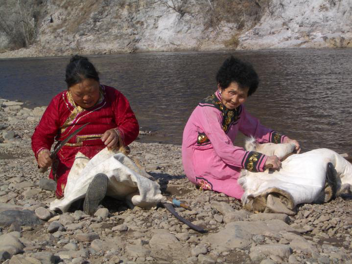 鄂伦春人过去在家庭公社“乌力邻”里,同生产共消费,在当时生产力十分低下的情况下,凭着扎枪和弓箭,单个人很难获得能够满足衣食需要的猎物,必须要有“乌力邻”全体成员的通力合作,才能战胜凶猛和庞大的野兽,所以,在“塔坦达”领导下的集体狩猎是当时最主要的劳动形式。随着生产力的不断发展和个体小家庭的大量流动,不仅社会组织“乌力邻”由原来血缘性的家庭公社演变为地缘性的地域公社,劳动组织也随之发生了极大的变化。集体狩猎已不再是“乌力邻”倾巢出动,而是由几个小家庭的成员自愿结合成“安嘎”来进行。同时还出现了集体和个人等多种劳动形式。狩猎也不再单纯是为了满足衣食的需要,剩余猎物可以拿去交换,猎产品已趋于商品化。故此时一些珍贵的细毛皮张和药用价值较高的兽类,成了鄂伦春人主要的狩猎目标。这样就形成了一年中的四个狩猎旺季,即:农历正月至2月是“鹿胎期”;4月至6月是“鹿茸期”;9月至落雪为“叫鹿尾期”;落雪后至来年开春是“打皮子期”。大概是源于原始的围猎,鄂伦春人把狩猎叫“打围”,而这四个狩猎旺季就叫“红围期”。“红围期”除“叫鹿尾期”外,都组织“安嘎”集体出猎。“安嘎”是一种临时性的狩猎组织,狩猎旺季将临时,由一人发起,串联几位亲朋好友或志趣相投的人组成一个“安嘎”,待猎期结束,“安嘎”自行解散,下次出猎时再重新组合,因此其成员并不是固定的(图为熟化狍皮,吴雅芝摄影)。
