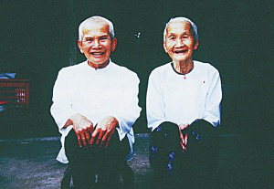 当我来到时,老人已经入殓。我借机打量傣家这从不许外人参观的、全家几代人都睡在里边的神秘的卧室。只见卧室是一个通廊,里边一长溜的帕垫(傣家人用来睡觉的棉被)都收裹起来,棺材就横放在卧室的中央,一个用竹子编成喇叭形状的灯架里有一盏燃着的油灯;棺材的上面横拉着一根筷子粗的尼龙绳,上面挂着一些筒裙衣物,想来可能是死者的;几个男性老人围着棺木而坐,往棺木上剪贴着白、绿、紫、黄几种颜色的纸花。随后而来的岩化告诉我说:“过世的老人已有82岁了。她生前为人随和,很受寨子里晚辈的敬重。死前已卧床一个多星期,不吃不喝,也无疼痛迹象,正所谓天年已尽,寿终正寝。”岩化还向我介绍说:按傣族的习惯,死者一咽气,亲友便立即用温水为死者洗澡、梳头、洗脸(洗脸时,由下向上,以示区别于活人),穿上新的衣、裤、袜、鞋,包新头帕。还要在死者嘴里放入一小砣金或银,称作含口钱。然后用白布裹尸,将死者双掌合十,放进棺材里,用一块方帕盖脸。最后盖上棺材,并通知寨子里的人。