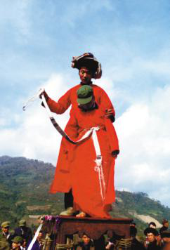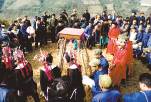 受戒仪式前前后后要举行好几天,一般依照受戒者家的经济条件来定。时间短的叫“小办”,时间长的称“大办”。但其中有一条,不论时间长短,度戒中的规矩是不能违背的。这次十几位受戒者合起来办的度戒,听说是七天七夜的“大办”。在这几天中,受戒者必须严禁会客、社交、唱歌等,只能低头修身养性,吃清淡无油的饭和水。度戒中最重要的一件事是聘请师父,有“度师”和“度道”之分,师傅自然有“师公”和“道公” 之分。师宗县蓝靛瑶中的度师为武戒,师公要负责“五台” 受戒仪式。度道为文戒,道公身穿红色法衣,负责念经求神等仪式。受戒祭师一般由德高望重的长者担任,他们是寨中一切主要事务的决策者,也是寨中最有学问的人。在受戒仪式中,他们要对弟子进行族史、族规、社会道德等多方面的教育。