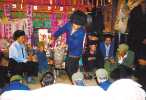 夜晚,在受戒者家里,师父为受戒者跳起“扁鼓舞”
