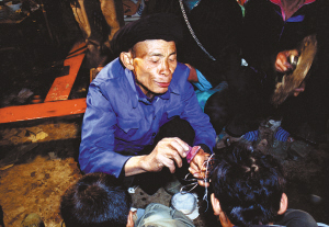 这天,我们刚好在县里采访,听说高良乡瑶族村寨要举行度戒活动,于是就直奔瑶寨而去。一进寨子,马上感觉气氛不同。瑶族妇女们头戴别致的大银盘,身着盛装,真像过节一样。经了解后,得知寨子里共有十几个男孩要参加这次度戒。寨子里的一位老人告诉我们,一般情况下,只是两三人,这样多的男孩一同举行度戒仪式是很难碰到的。看来,我们的运气还真不错。我们来到度戒地点,见到将要度戒的十几个男孩集中在一起,用棉被蒙着头,不能见阳光,要等仪式完后,才能见阳光。