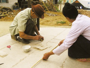 言谈间,岩妞把制好的竹环放入早已画好的同心圆图案中的小圆上,只见竹环大小正好与小圆吻合。岩妞说,图案外侧的大圆便是摆放棉纸用的。接着,他把手中厚厚的几张棉纸围绕着已经放入图案中的竹环依次摆入,直至摆满。在同心圆图案的上侧,岩妞还画了一个宽与同心圆图案的直径相符的矩形图案,把棉纸铺满其中。岩妞说,这图形就是“贡菲”的高度。制作的最后一道程序,是把棉纸用浆糊粘合起来。阴干后,一个“贡菲”就做好了。