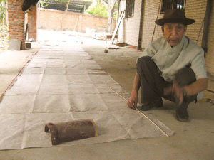 岩妞说,制作孔明灯最主要的材料是傣族的棉纸和竹编。棉纸来源于木棉树。傣家人摘取木棉树的树叶并用牛油来煎熬,使之变为暗白色的浆汁,待熬熟之后便拿到河边冲洗,把其中的灰尘和沙粒洗净。随后,将洗净的木棉树浆汁摊均匀后在阳光下曝晒,晒干后便能拿来制作孔明灯了。一般的纸很容易被烧坏,而这种手工制作的棉纸韧性好,不容易撕裂和烧坏。