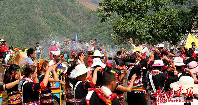 节日清晨,在象脚鼓乐和歌声中,年轻人将水桶高高举过头顶,将水滴洒在老年人的手上,祝愿他们生活快乐、健康长寿。老人们则伸出双手,将水捧在手中,口念祝词,为年轻人道喜、祝福。这种仪式之后,人们便以象脚鼓为前导,排成长队,拥向泉边、河畔,唱歌、跳舞,互相追逐、泼水。从头到脚,全身湿透。这是吉祥的水,祝福的水,人们尽情地泼,尽情地浇,不论是泼水者还是被泼者,都高兴异常,笑声朗朗。杨腊苦介绍说,浇花节既是德昂族人民欢度新年的典礼,又是男女青年谈情说爱,寻找心上人的好时机。