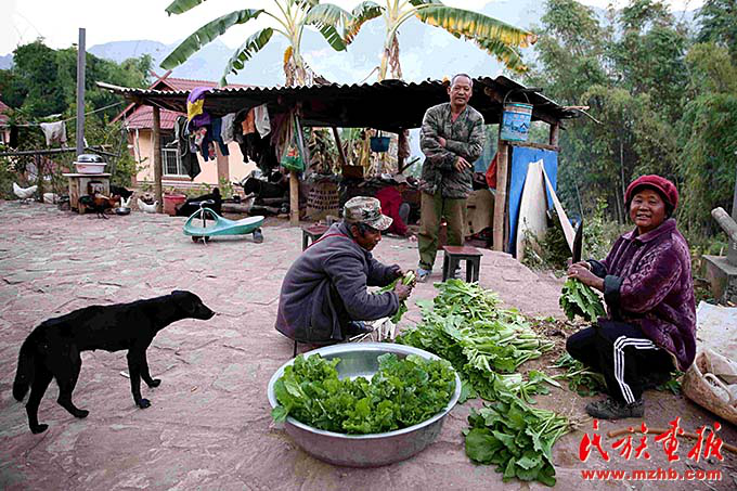 在娜作家记者见到了娜作的老伴儿大岩恩,他边清理打捆着刚刚采摘下来的青菜边说:“这些小菜城里人特别爱吃,没有上化肥,一点污染没有。这筐菜在城里一定能卖个好价钱。”