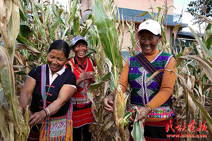 娜巴来三姐妹在苞谷地里愉快地采摘苞谷,身后就是新房子