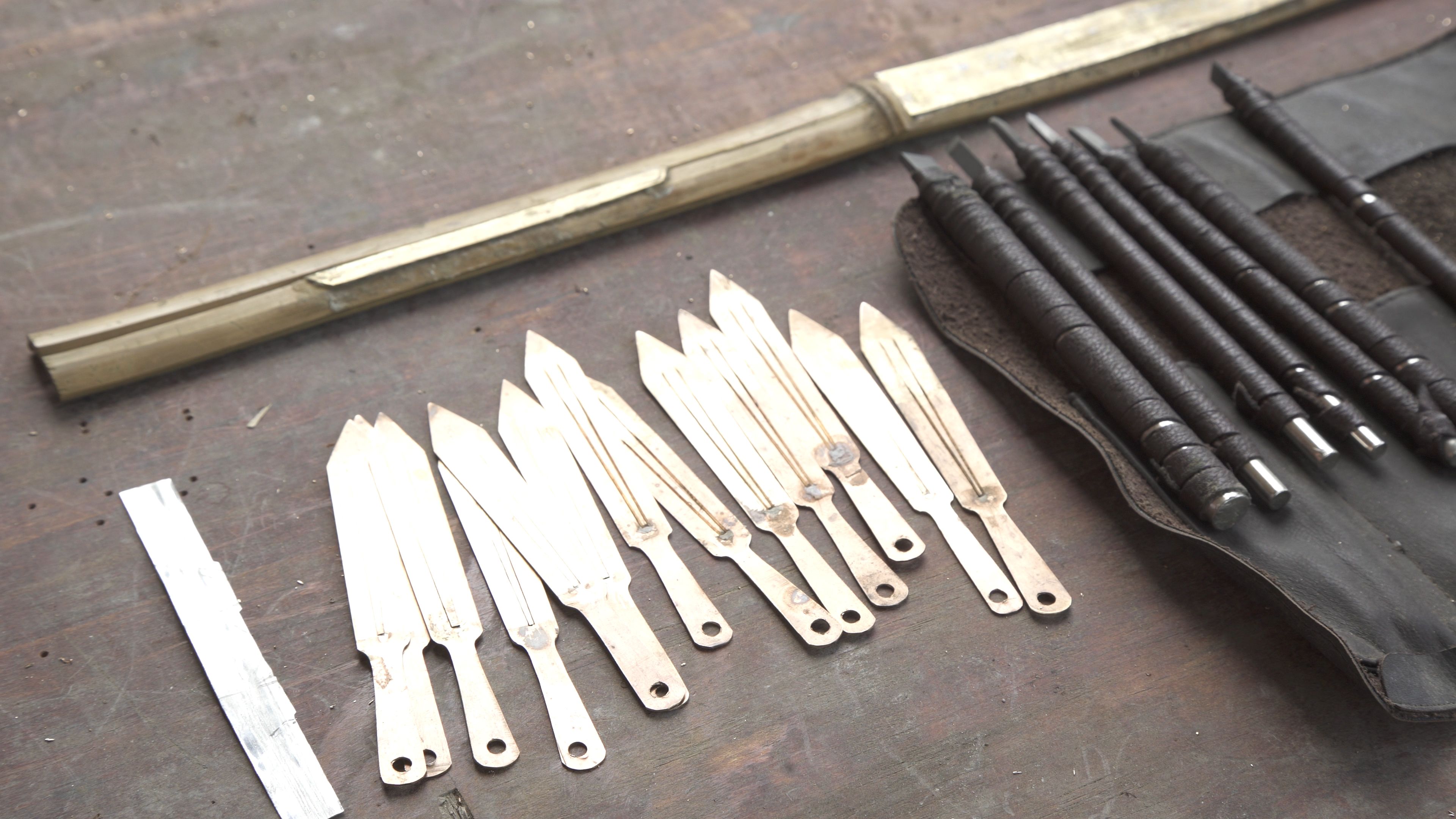 贵州贵阳清镇市流长乡腰岩村苗族制作口弦所需材料和工具-铜黄片、竹子、小刀、凿子