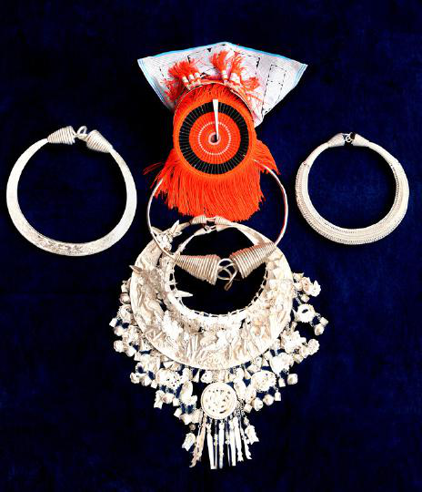 苗族银饰制作精巧,花样古朴,富有想象力,且种类繁多,主要有银角、银冠、银项圈、围腰链、银手镯、银衣片等100多种。即使同一品种,纹饰也各有千秋。