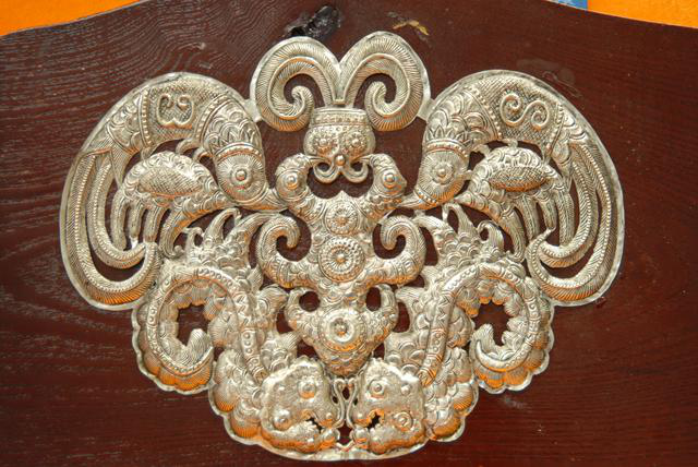 流传于剑河境内的苗族银饰通常以龙、虎、昆虫、花鸟等动植物图案为基本素材,加上链状绞花、錾花、压花、编花相互配合,精美中透着灵气。剑河苗族银饰根据造型不同,分为三个片区:革东片区的项圈为链状绞花式;南寨片区的项圈为板圈式;久仰片区为横板头式。