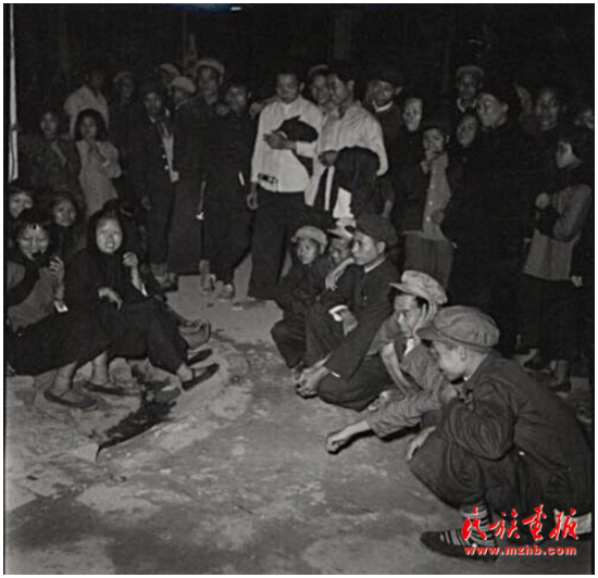“歌圩”是桂西壮族古老的风俗。每年农历正月、二月、四月都有歌圩日。图为1957年广西壮族自治区凭祥市郊区的歌圩日,这里不但处处欢歌笑语,还有抢花炮、演壮戏、舞彩龙、舞彩凤、唱桂剧等很丰富的文娱活动