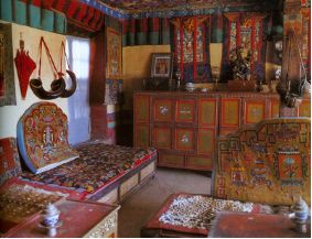 柱头装饰包括柱头、斗拱、大梁等部位的雕刻、彩绘。在藏族居室中柱子、横梁位置显要,因此对这部分的装饰在整个室内装饰中至关重要。无论高雅精致的殿堂还是普通百姓的民居都充分认识到这一点,进行合理装点以求庄严、堂皇、舒适的效果。就拿寺庙集会大堂的柱头、横梁来讲,装饰十分考究。天花板下的椽子木顶端整整齐齐地、略有间隔地排列在大梁上方,用彩绘的办法进行装点。椽子至大梁之间夹着两道横杠,其上道用累卷叠函凹凸方格木雕处理,下道横杠用莲花瓣依次排列的雕刻或彩绘完成,这种装饰是约定俗成的,上下图案不能随意调换。横梁上的装饰大多采用填充连接长方格来进行。横梁表面划分大小等同的长方格,这些连接的长方格内或填写梵文经文,或绘各种花卉,用这样的手段装饰大梁。柱头与横梁之间是斗拱,藏族建筑对斗拱的装饰非常讲究。斗拱分两层,上为长弓,下为短弓。斗拱长短两弓本身形状要精心雕搂,其表面也用雕刻着色的办法加以渲染,以求良好的装饰效果。斗拱装饰有简有繁,最简单的斗拱形状为梯形,这种不加任何雕饰的斗拱多见于底层的储存室内。而寺庙建筑大堂、佛堂之类重要殿堂内的斗拱是经过精心雕镂的艺术品,尤其是斗拱长弓形状千姿百态,通常见得较多的有祥云状,此外还有各种花瓣状,其装饰效果相当强。除了斗拱形状的雕刻外,表面上雕刻各种图案获得锦上添花的效果。长弓中心雕刻佛像,两边及边缘雕刻祥云、花卉、整个斗拱表面显得饱满、大方。柱子、柱头也是装点的一个良好的空间,柱子形状有圆有方,也有部分多角柱。柱子最上面的部位或雕或绘花瓣,在下是长城箭垛式图案,这两样图案的下面是短帘垂铃式图案,所有柱头装饰图案基本上按此模式制作。除了雕镂精细的寺庙大殿柱头大梁装饰以外,大量的柱头装饰见于藏族民居室内。民居室内柱头大梁装饰的基本走向、风格与寺庙装饰设有大的区别,彩绘图案、颜色运用、布局结构除了个别外,与寺庙装饰相同,只是民居室内柱头大梁装饰多半是彩绘,几乎见不到雕刻,这是经济条件所限呢还是等级待遇不同不得而知。两者除了装饰上的简繁区分之外其余部分很好地保持了藏民族建筑风格的一同性。