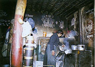 大门由于它的位置所在不应该列入室内装饰,但它与室内装饰息息相关,连成一体,故我们把它当作室内装饰在这儿加以介绍。门框装饰包含门框本身、门楣、门楣上的屋檐、门板等。藏族建筑大门装饰十分讲究,从屋檐到门坎都用雕、绘的手段充分加以装饰。屋檐用两道方本间隔排列,上盖青石片和黄土筑成底小头大的形状,它不仅有美观的装饰效果,而且起到防水作用。屋檐下是门楣,门楣上彩绘各种图案,门框的木构件上雕刻莲花花瓣和累卷叠函凹凸方格图案,这种图案处理形式大部分民居大门大同小异。门板为单开式,板门为了加固起见上、下分层钉铁条。门板一般涂单一色,不作绘画处理。除了这些装饰以外,门相上挂短绉帘,门框左右边缘墙上涂两道黑色竖条,每年过年前短绉帘要弃旧换新,黑色竖条与粉刷外墙一道重新涂漆,这是一般民居门框装饰。寺庙门框装饰较为复杂,门楣的间隔方木上加一层雕刻动物头像的木雕作品排成一行,装饰门楣这一板块,门框木构件多则六、七层,层层雕刻各种图案,可见其讲究程度。寺庙门板大多是对开式,用铁条包装门边缘,中间分层钉铁条,涂一层单一的颜色,特殊殿堂如扩法神殿大门门板上要进行绘画处理,寺庙大门讲究厚重、庄严。无论是民居大门还是寺庙大门,其装饰要求与室内梁柱装饰相协调,从颜色的运用到雕刻内容都要做到这一点,保持内外装饰效果统一。