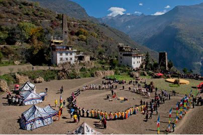 盘好发髻,佩戴好头饰,在肩、背系好五彩哈达后,由本村具有威望的女性长者引领来到仪式现场。法号声中,煨桑的青烟袅袅升起,威严的活佛主持诵经祈福仪式。随后,德高望重的长者为参加仪式的女子送祝福茶,长辈为姑娘们献哈达。一系列仪式结束后,无论男女老少,都来到场地中央,踏歌起舞,跳起吉祥的锅庄。