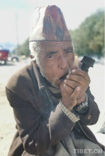 图为普兰边贸市场边吸烟的尼泊尔人