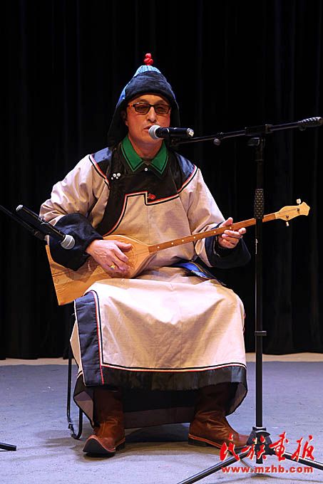 和布克赛尔蒙古自治县江格尔传承人(左)表演《江格尔说唱》。
