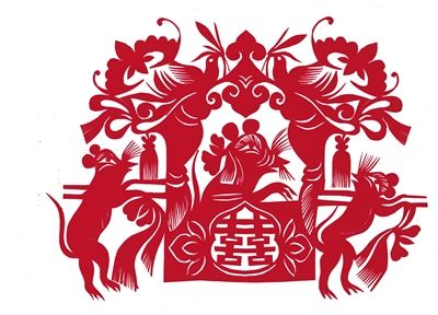 冬日的阳光透过玻璃窗,洒在老屋的炕上。几位妇女在炕上铺一块布,对窗盘腿而坐,然后一手捏红纸,一手拿剪刀,神情专注地剪“老鼠嫁女”。这是春节前在和林格尔县河头村看到的画面。老鼠嫁女,也叫老鼠娶亲,在传统剪纸中有不同的版本。据了解,民俗剪纸“老鼠娶亲”在清道光年间就开始流行了。欣赏和林格尔剪纸传承人创作的“老鼠娶亲” ,老鼠的形象多采用粗犷轮廓,又用细线条加以衬托,如老鼠胡子、花轿穗子、喜鹊羽毛、花纹等。河头村的妇女剪窗花时,鼠是常表现的题材之一,被称为“灵人”,如老鼠舔灯盏、老鼠偷瓜、老鼠吃葡萄、鼠咬天开等。几十年前,段莲女老人剪的老鼠灵活生动,富有动感,远近闻名,她的 “吉祥鼠”剪纸技艺传承至今。