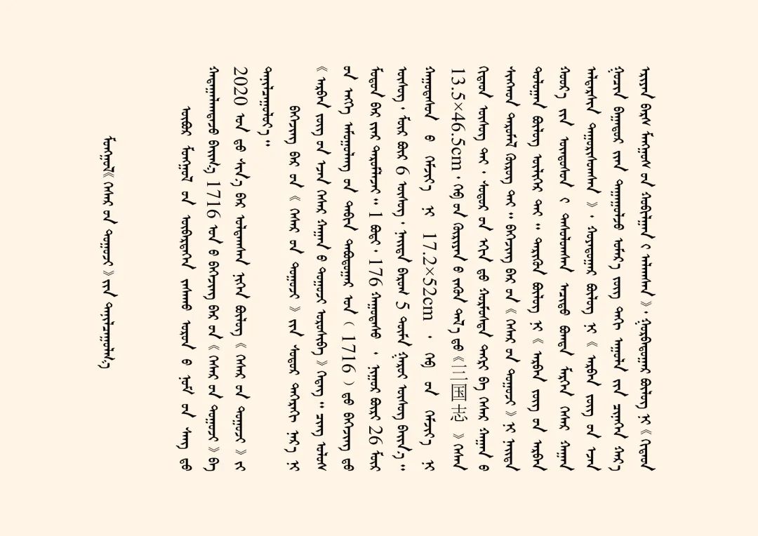 今天我们主要讲述的是1716年北京木刻本蒙古文《格斯尔传》(全称为《十方圣主格斯尔可汗传》)是清康熙五十五年(1716)北京木刻本。梵夹装,1卷(176叶),每页26行,每行6个字,约5万多字,页面高17.2cm、宽52cm,版框高13.5cm、宽46.5cm。版框左侧有汉文《三国志》三字,首页刻有朱印佛像。
