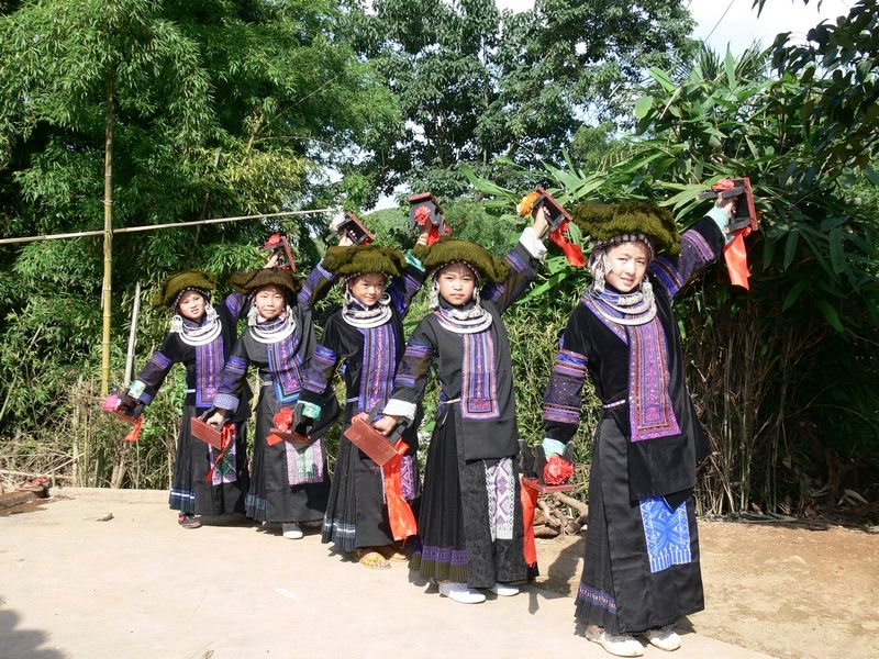 板凳舞,苗语称:“卡牛档”。关于它的起源,在黑苗中一直这样流传:相传在很久以前,寨中的男子都参军打仗去了,剩下老人、妇女和小孩,由于地处高山,深林密布,经常有野兽出没,妇女们为了壮胆,白天晚上都喜欢聚在一起,用小板凳互相击打,敲出声响,驱赶野兽……渐渐地,就慢慢演变成了在当地苗族妇女生小孩办满月时,拿小板凳敲击舞蹈祝福小孩的习俗。