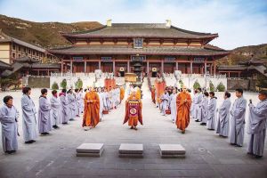 道安法师依外来佛教律法而别立符合中国国情的僧制,为唐代百丈禅师创立清规开辟了先例。图为寺院的传授菩萨戒请师仪式。 河北兜率寺供图