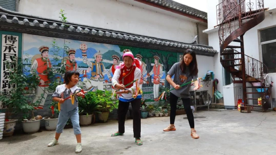 何松康将霸王鞭打法传承给儿媳(右一)及孙女(左一)▲