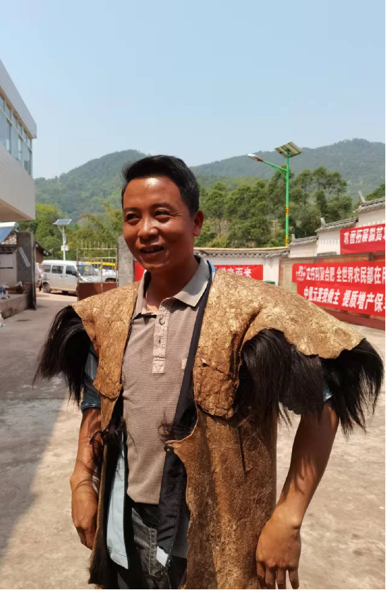 在大叔眼里,羊皮衣是祖辈传下来的宝贝,冬暖夏凉、耐脏又耐磨,既是雨衣也是地垫。天冷时毛面朝里防寒保暖,下雨时毛面朝外化身为雨具,田间地头劳作时还可以把它当成地垫平铺在田埂边休息,骑摩托车时是一件方便的防风服,实现了一衣多穿,多功能使用。