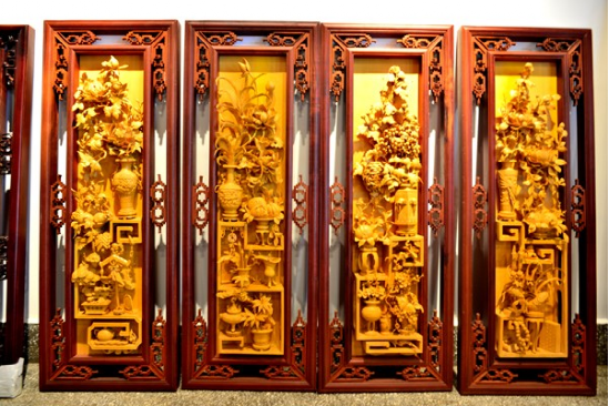 《四条屏挂件》脱胎于“格子门”的上裙板,是由实用到观赏的一种很好的转换,是目前最走俏的新产品,无论是宾馆客厅或居家,古朴典雅的木雕“四条屏”会增添不少东方文化的雅趣,越来越受到人们的喜爱,许多人都把它作为木雕艺术珍品收藏。为了给世人留下艺术精品,许多工艺师潜心研究设计、精心雕刻,用半年、甚至一年多的时间才完成一件“四条屏”。这些精心之作,疏密有致、变化统一,构图饱满,穿插缠绕,重重叠叠的层层透雕,无不凝聚着制作者的智慧与心血。《四条屏》的图案设计,主要有三种内容:(1)博古;(2)花卉;(3)花鸟。人物、山水类型的极少。图案喻意与格子门相近。