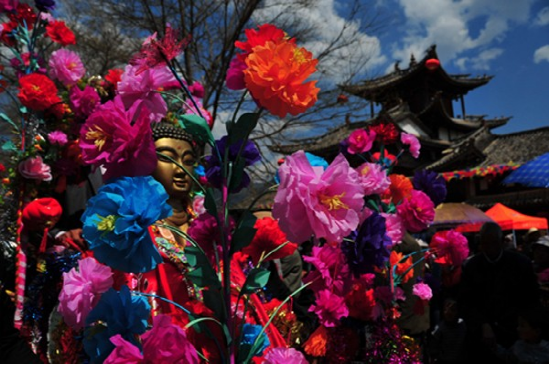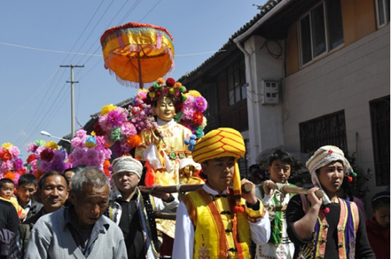 农历二月初六,迎太子入城。这一天在佛教徒的带领下,人们焚香沐浴,衣冠整齐,虔诚地将“太子”(用布扎油漆制成的太子行像)请到行宫或本主庙里。这一年的新郎为太子抬轿,希望能得到太子的保佑而使新婚的妻子孕生男儿。