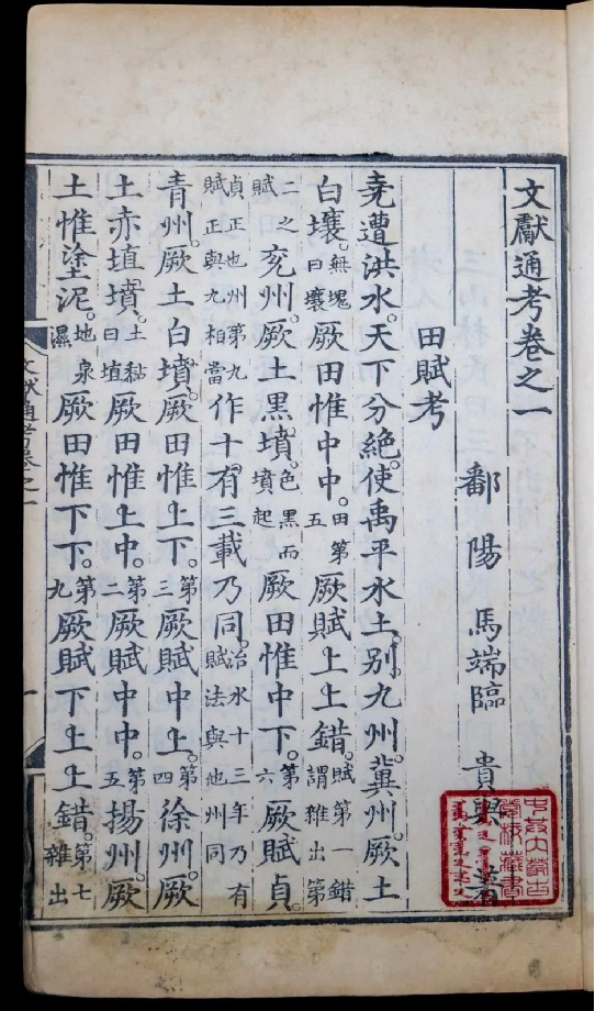 内蒙古党校图书馆藏《文献通考》三百四十八卷,(元)马端临撰,明嘉靖三年(1524)司礼监刻本,一百四十六册二十九函。版框高二十五点七厘米,宽十七点六厘米;开本高三十三点二厘米,宽十九点九厘米。半叶十行行二十字,小字双行同。粗黑口,四周双边,双对黑鱼尾。鱼尾中镌书名、卷数、页码。卷前首列嘉靖三年(1524)明世宗《御制重刊文献通考序》,次列至治二年(1322)六月饶州路乐平州刊印《文献通考》抄白、延祐六年(1319)四月王寿衍《进文献通考表》,马端临自序、目录。