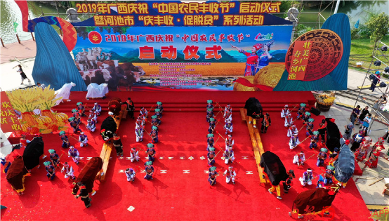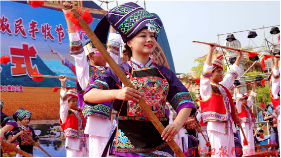 都安瑶族自治县群众打起扁担,欢庆“中国农民丰收节”。