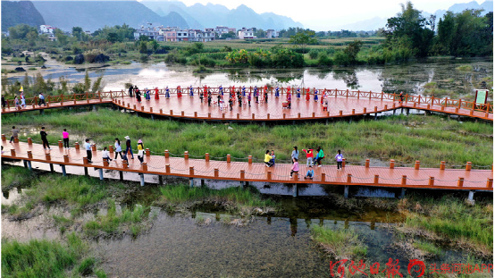都安各族群众在澄江国家湿地公园表演打扁担。