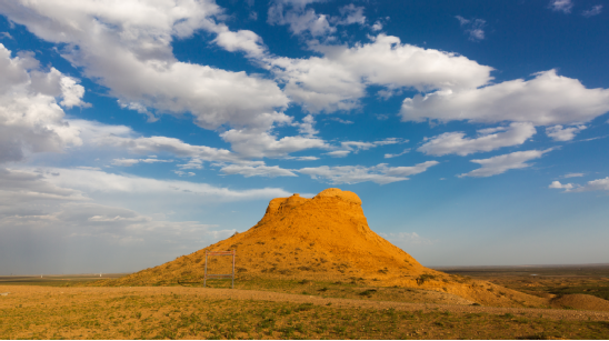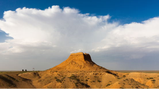 (东红烽火台,位于海南区巴音陶亥镇东红村,整体为红黏土夯筑而成,现高9.3米)
