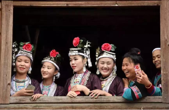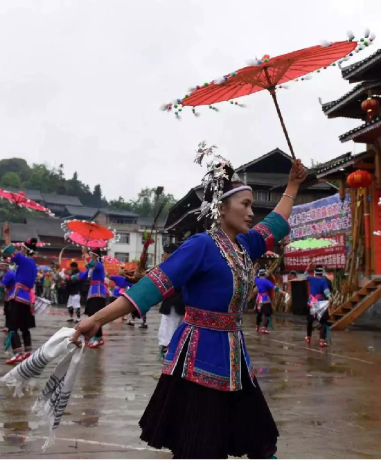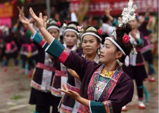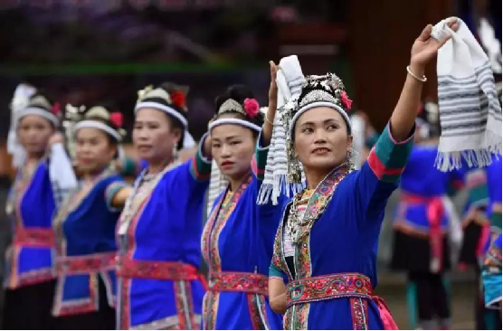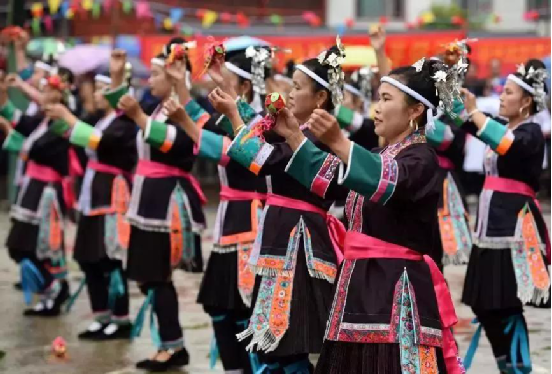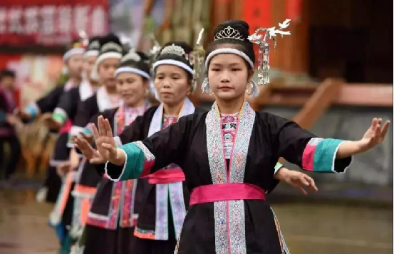 侗族妇女在表演民族舞蹈