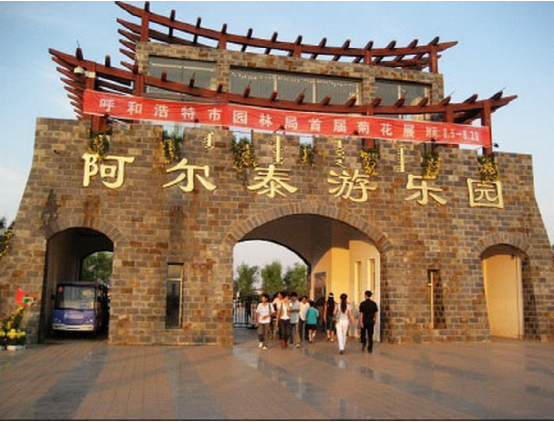 阿尔泰蒙语译为“金色”。阿尔泰游乐场是由北郊防风林、麻花板和三合村的沙坑,垃圾场改造而成,是内蒙古自治区最大的游乐园。该项目有效利用了曾经的污染源和沙尘源,将其改造成为一座以游乐为主,集餐饮、娱乐、休闲为一体的环境优美的大型现代化休闲娱乐场所。游乐园一期工程于2005年5月1日开工建设,由北京市政一公司和呼和浩特市华春园林工程有限责任公司承建,完成投资6400万元,于2005年10月1日开园,取得了较好的社会效益和经济效益,一期工程完成绿化、硬化面积58公顷以及过山车、勇敢者转盘、激流探险、丛林飞鼠等大中型游乐设备20项;二期工程于2005年11月2日开工,计划投资3000万元,于2006年11月底完工,二期工程已完成88米高空观览车、卡丁车等游乐项目。