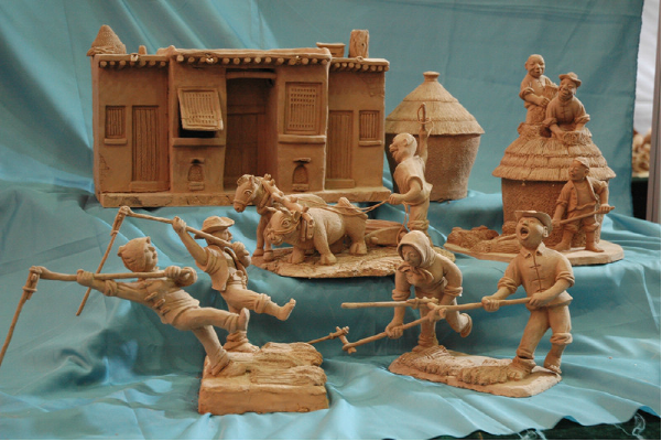 泥塑艺术是我国一种古老常见的民间艺术。它以泥土为原料,以手工捏制成形,或素或彩,以人物、动物为主。不同的民间风俗,流传着很多动人的传说故事,这些构成了泥塑艺术的精神内核。民间泥塑的用途主要有祈子延寿、纳福招财、驱邪避灾和装饰摆设等。泥塑成本低,费工少,是老百姓喜闻乐见的艺术表现形式,它往往和节令、礼仪、风俗联系在一起,反映的是当地农村人们日常生活的不同场景,人物栩栩如生,场景鲜活生动。