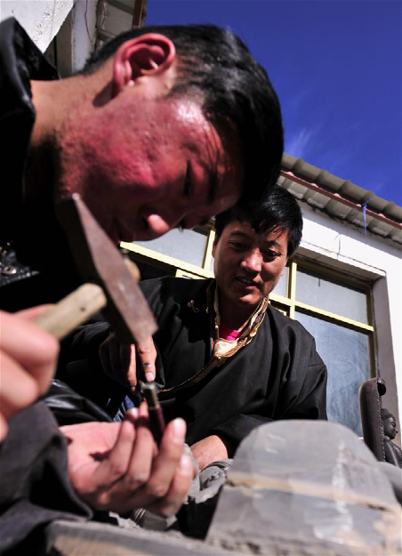 土登加措(右)和他的徒弟在雕刻黑玉石佛像(1月8日摄)。