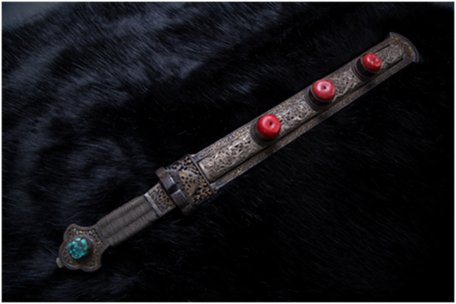 康区人性格粗犷豪放,刀对于他们来说,主要是战斗的武器,他们爱刀胜过爱牛羊,一把好刀就是一笔财富,其形象也会因之而无形中高大起来。正因为如此,他们不仅对刀本身有较高的要求,对其作为衬托武士气概的刀的外在形制也有特殊的喜好。刀鞘材料一般使用黄、白铜或纯银,镶珠嵌宝,正面雕龙画凤,背面线刻卷草,佩在身上,起到了美观和威慑的双重作用。