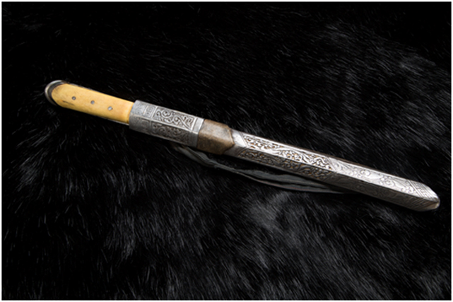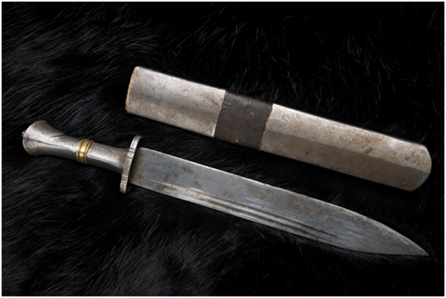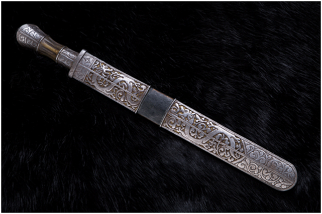腰刀,骨柄,铁鞘缕空,兽皮勒鞘,清代