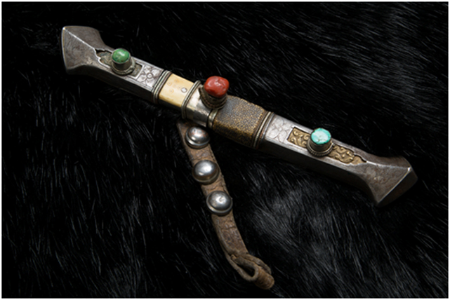 安多地区主要以放牧为主,牧民的刀主要用于宰杀和吃肉,有严格的男用女用之分,男式刀长度在一尺以上,女式刀在一乍左右,刀鞘的底部和刀柄的末端上翘,呈船形。安多人喜欢珠宝,头饰、胸饰、腰饰无不光灿耀人,这些饰物同样被用在刀上,刀鞘和刀柄锚金错银,镶嵌着珊瑚和绿松石,像精美的艺术品。