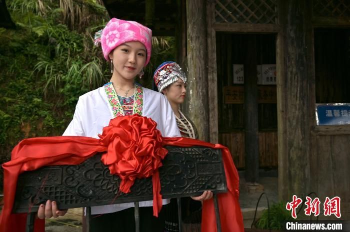 图为村寨姑娘身着壮乡民族服饰迎接游客。 俞靖 摄