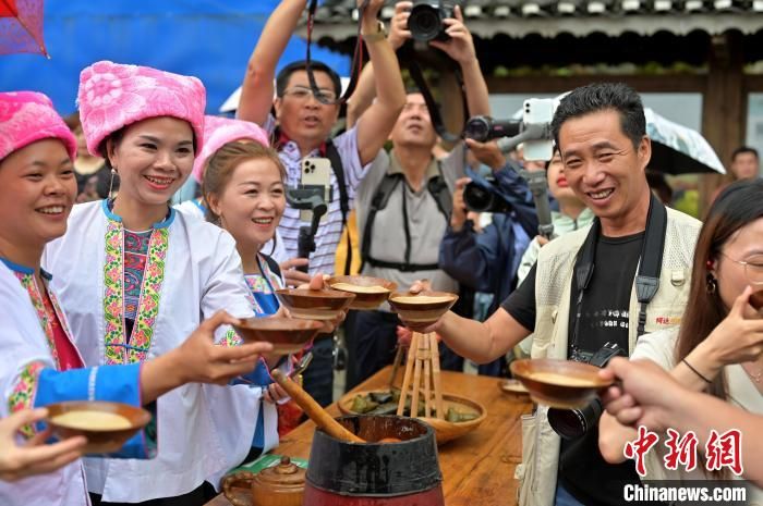 图为游客品尝迎宾酒。 俞靖 摄