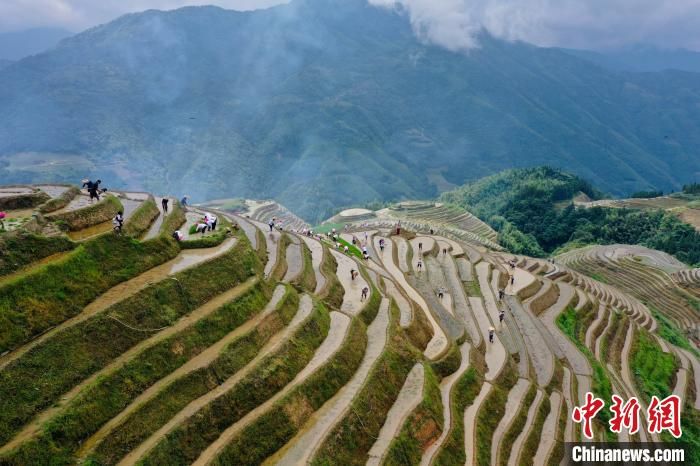 6月13日,桂林龙胜各族自治县龙脊镇平安村举行2021龙脊梳秧节。当天,大批游客齐聚平安村寨口,饮迎宾酒,感受龙脊梯田传统农事活动的魅力。据了解,梳秧节作为龙脊镇民间的传统节日,每至芒种时节,村民会在田边向“秧母娘娘”祈福,盼五谷丰登。