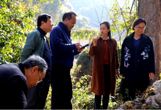 广南凌娅原生铁皮石斛科技有限公司董事长周艺畅(右二)给云南社科专家介绍种植铁皮石斛情况。(兰天明摄影)